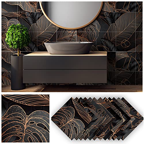 Alwayspon 12 stuks, 20 cm x 20 cm, vinyl vloer/wandsticker voor transfer, slipvaste sticker voor keuken badkamer, zelfklevend, zelfklevende PVC-sticker voor tegels, zwart en goudkleurig marmereffect