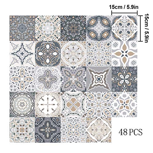 Bestine 48 stuks tegelstickers, zelfklevende waterdichte Marokkaanse keuken badkamer vloer muur tegelsticker mozaïek Victoriaanse retro stijl tegeloverdracht voor woondecoraties (48 stuks, 15 x 15 cm)